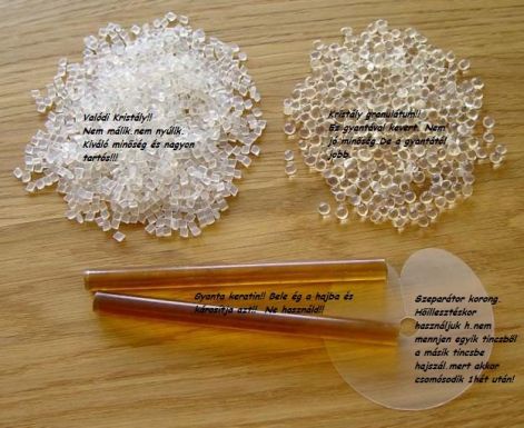 - A képen látható bal oldali szép fehér anyag az eredeti Kristálykeratin amivel mi is dolgozunk, (Tartos könnyen kezelhető, nem rasztásodik a haj)